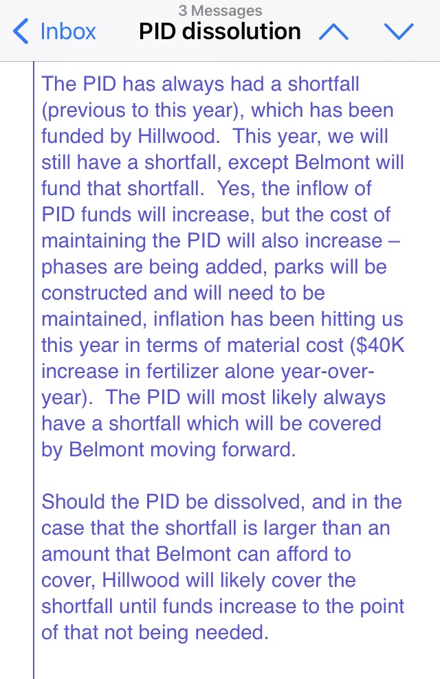 Below is from Jerry to a resident during the PID dissolution discussion. He states that Belmont will be funding the PID shortfall in the future. This aligns with what Angie stated at the public meeting that Belmont will be taking over some PID responsibilities. And I got the same answer verbally from Tim. But at the time, Clay nor anyone with Belmont knew what they were referencing. I asked. This contract seems to be what they were referencing.