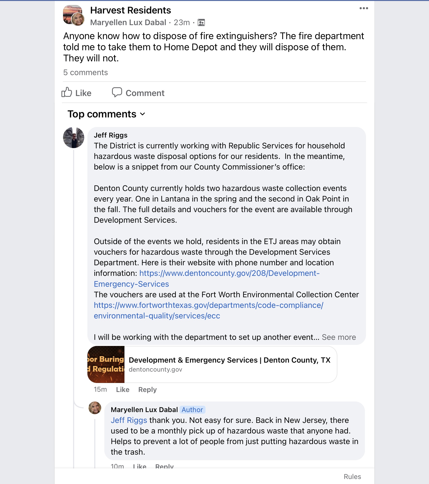 Hey all, just wanted to share a question that I saw and replied to today on our Harvest Residents Facebook group. No action needed. Since it’s related to our current discussion about household HazWaste I wanted you all to be aware of it is all.