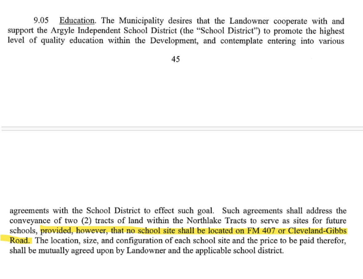 Patricia also found language in the Development Agreement that Northlake stipulated no school on Cleveland Gibbs or 407. That has been sent to Kelsey for guidance on if/how this impacts the issue in front of us. It was likely included to avoid the very traffic flow and pedestrian safety issues we are now facing.